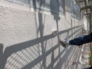 外壁の最終工程として高弾性防水塗料の2回目仕上げ塗装を行いました。