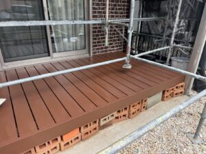 人工木のウッドデッキをオールウッドという塗料にて仕上げ塗装を行っております。